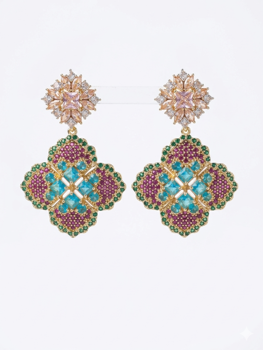 Vintage Gold-Plated Cushion-Cut Pink Crystal and Multi-Color Pavé Cubic Zirconia Statement Drop Earrings for Women – Intricate Multi-Gemstone Chandelier Earrings – Floral Quatrefoil Motif for Weddings, Parties, and Pageants