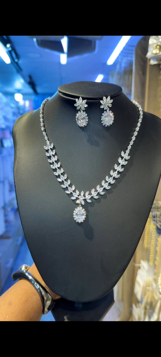 Elegant V-Shape Leaf Jewelry Set - Brilliant Marquise Cubic Zirconia Necklace & Drop Earrings - Silver Tone Bridal / Wedding / Gala Set