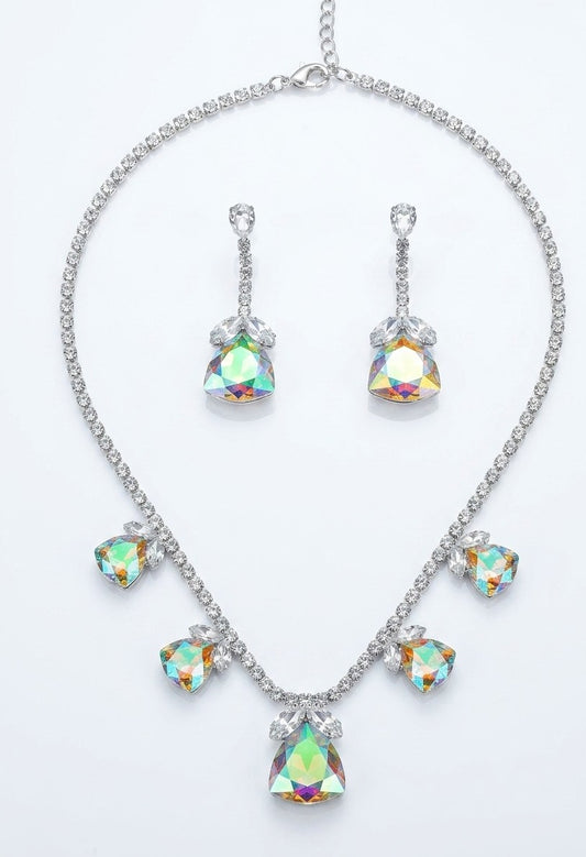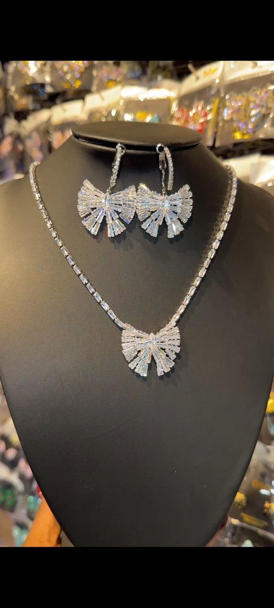 Sparkling Statement Necklace Earrings Set Rhinestone Fan Bow Pendant Bridal Prom Jewelry