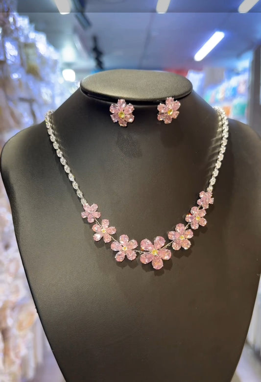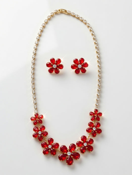 Bold Red Rhinestone Flower Necklace Earrings Set Crystal Floral Choker Bridal Prom Jewelry